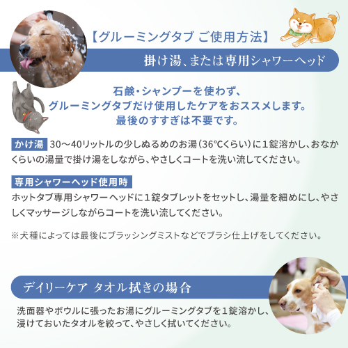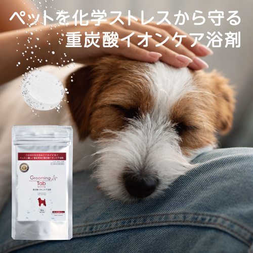 グルーミングタブは、非常にデリケートな皮膚を持つ犬猫用の中性pH、香料・着色無添加、塩素中和の重炭酸イオンケア浴剤です。