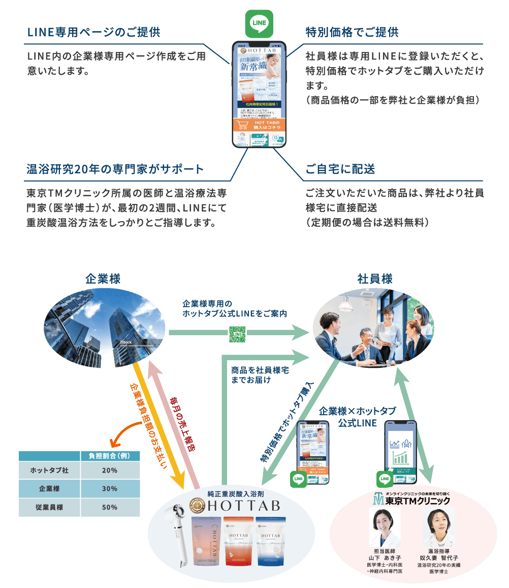 純正重炭酸入浴剤による“温浴ケア”が血流を促進し、疲労回復をサポート。企業全体のパフォーマンス向上に貢献する、これからの健康支援のかたちです。