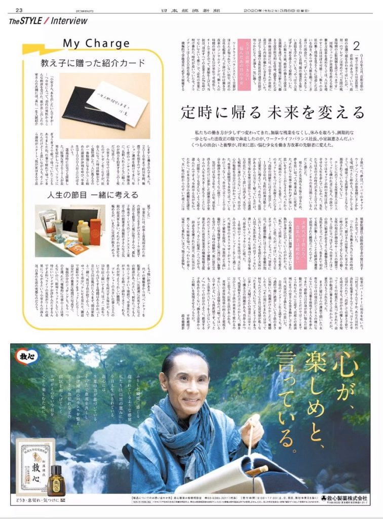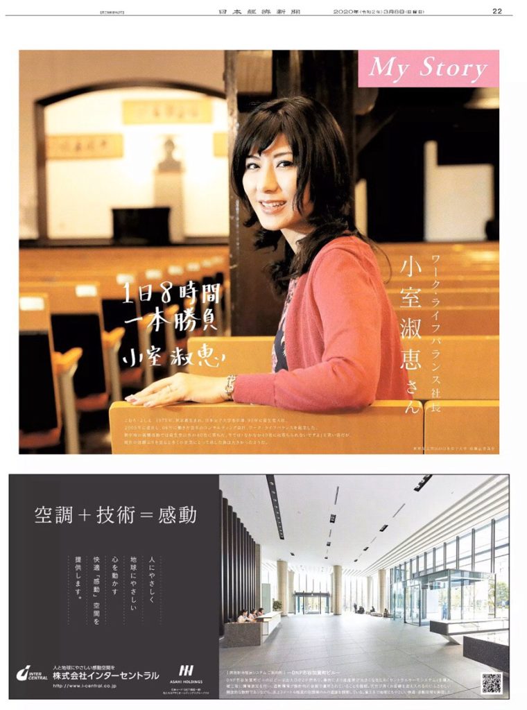 3月8日の日経新聞朝刊23・24面に、働き方改革の推進で安倍総理と直談判した事で有名なワークライフバランスの社長小室淑恵さんが特集記事My Storyでご自分の愛用するコスメグッズを写真付きで紹介しております。